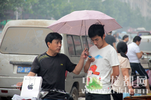 上午8點(diǎn)30分天空下起小雨一家長(zhǎng)為考生撐起雨傘。(戚永/攝)