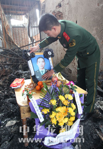 ????正月十五元宵節(jié),人們齊聚在鄭春光犧牲的那間不大的商鋪門前,在那間已經(jīng)被熏黑的墻壁上掛上潔白的小花:“鄭春光你是人民的好兒子”、“春光我們永遠懷念你!”、“春光一路走好!”字字真情、句句感動,表達著人們對這位好男兒的無限哀思。人們端來了熱騰騰的湯圓放在鄭春光犧牲的門前,所有的人們面對春光犧牲的地方,為他們心中的英雄深深地鞠了三躬。一位淚流滿面的老人哽咽著:“春光,好孩子,我給你送元宵來了!好孩子,你吃點吧!吃點吧!”在場的人們哭聲一片。