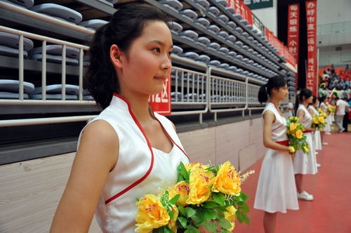 禮儀人員手捧鮮花站立在會場兩側。