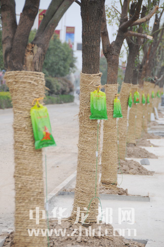 行道樹集體“打點滴”,是生病了,還是有別的原因?當日上午,記者來到周口大道與慶豐路交叉口,看到路旁幾十棵新種植的小樹全部掛上了綠色吊瓶(如圖),上面寫著“大樹AG營養(yǎng)針液”。綠化工人在樹干上鉆一個小洞,然后把營養(yǎng)液的軟管放在里邊。扎針、綁膠帶、調節(jié)輸液器,小樹像極了病人。