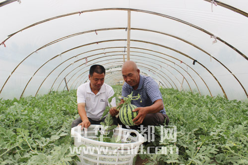 ?? 近日,項(xiàng)城市南頓鎮(zhèn)大棚西瓜基地開園,培育的“半截樓”8428西瓜,因果瓤脆嫩、味甜多汁走俏市場。該基地?fù)碛写笈?0多個(gè),占地面積120多畝,畝均收入2萬多元。圖為該基地工作人員在采摘西瓜?! 。ǚ簿颁h 攝)