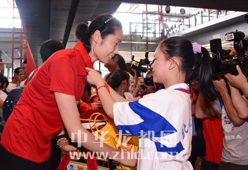 9月7日,一名學(xué)生在機(jī)場(chǎng)為載譽(yù)歸來(lái)的朱婷佩戴紅領(lǐng)巾。