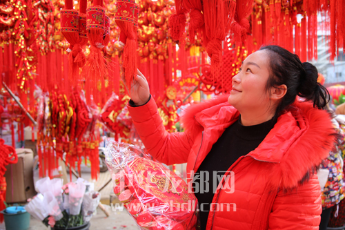 ????2月4日,在項城市水寨辦事處的一家商鋪前,市民正在挑選吊飾。新年臨近,當?shù)匕傩占娂姷绞袌錾线x購鮮切花、紅燈籠、中國結等節(jié)日飾品。 張永久 攝