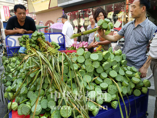 ????7月25日上午,在周口中心城區(qū)六一路上,一些流動(dòng)攤販正在販賣荷花、蓮蓬,縷縷清香沁人心脾,引得不少市民爭相購買。晚報(bào)記者 朱海龍 攝