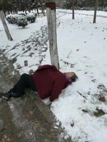 ????11月23日早上,大雪過(guò)后的周口銀裝素裹。在一家教育培訓(xùn)機(jī)構(gòu)上班的老師單啟航像往常一樣來(lái)到周口中心城區(qū)濱河公園晨練。7時(shí)許,單啟航在濱河路(市中心醫(yī)院北面)看到一位上了年紀(jì)的老大娘躺在雪地上,一臉痛苦。