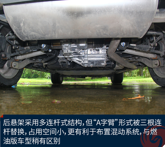 ????????由于電池放置在車輛的底盤和后備廂底部,降低了最小離地間隙。后懸架采用多連桿式結構,但“A字臂”形式被三根連桿替換,占用空間小,更有利于布置混動系統(tǒng),與燃油版車型稍有區(qū)別。