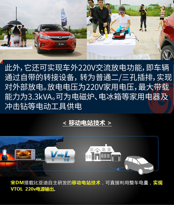 ????????宋DM可實現(xiàn)車外220V交流放電功能(VTOL),即車輛可通過自帶的轉接設備, 轉為普通二/三孔插排,實現(xiàn)對外部用電器放電。放電電壓為220V家用電壓,最大帶載能力為3.3kVA,給日常家用電器供電一點沒問題。