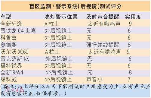 在測(cè)試當(dāng)中,車(chē)天下君留意到,不同品牌設(shè)定的盲區(qū)警示“激活”車(chē)速的要求不盡相同。在被譽(yù)為“安全之車(chē)”的沃爾沃XC60上,車(chē)天下君再度體驗(yàn)了一把“低速”(低于30km/h)也有盲區(qū)警示的好感,甚至于在車(chē)天下君要在盲區(qū)有車(chē)的情況下仍要并線,或者與側(cè)向車(chē)輛距離太近,沃爾沃XC60都會(huì)發(fā)出蜂鳴聲,并在中控臺(tái)的抬頭系統(tǒng)中,發(fā)出紅色警示。而且,沃爾沃XC60最讓車(chē)天下君倍感好感的是,盲區(qū)紅色警示燈設(shè)置在兩邊的車(chē)內(nèi)A柱內(nèi)側(cè)上,駕駛員不需要費(fèi)勁,紅色警示燈就在視野范圍內(nèi)清晰看見(jiàn)。類似這樣將紅色警示燈放在A柱上的,還有全新軒逸,在這樣一款10萬(wàn)元的車(chē)子上,搭載了BSW變道盲區(qū)預(yù)警系統(tǒng)很讓人驚喜,要知道如福特、科魯茲等都是高配車(chē)型才會(huì)有。而且,軒逸這套系統(tǒng)的提示可謂“無(wú)處不在”,一經(jīng)發(fā)現(xiàn)車(chē)輛進(jìn)入盲區(qū),BSW變道盲區(qū)預(yù)警系統(tǒng)就開(kāi)始工作,通過(guò)儀表盤(pán)的TFT顯示屏、提示燈、提示音進(jìn)行預(yù)警,能有效降低變道盲區(qū)碰撞風(fēng)險(xiǎn)。不過(guò)呢,以上這些提升好感度的安全警示效果,全新軒逸需要在車(chē)輛行駛速度>32km/h時(shí)才會(huì)“激活”。
