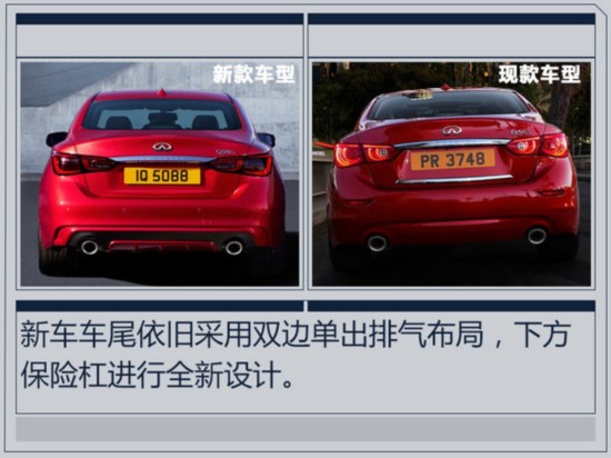 全新英菲尼迪Q50對(duì)外觀進(jìn)行了調(diào)整,前臉采用上下分體式格柵設(shè)計(jì),上格柵為網(wǎng)狀造型,保險(xiǎn)杠下唇為碳纖維材質(zhì)。車尾取消了車牌下方鍍鉻飾條以及兩側(cè)反光板,下方保險(xiǎn)杠換裝黑紅雙色護(hù)板。