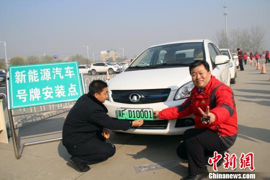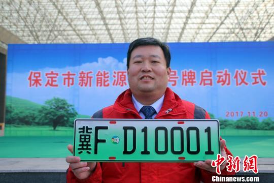 ????中新網(wǎng)保定11月20日電 (呂子豪 于俊亮) 20日,河北省公安廳副廳長劉云峰將冀FD10001新能源汽車專用號(hào)牌正式頒給保定市民康辰龍。據(jù)悉,該新能源汽車將享受“不限行”的交通管理優(yōu)惠政策。