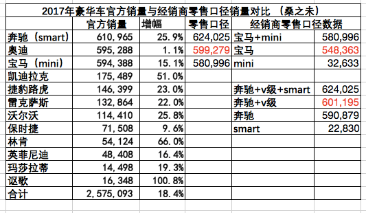 如果以經銷商終端零售口徑統(tǒng)計,奔馳(含smart)2017年銷量為624,025輛,其中奔馳品牌(含v級車)為601,195輛;奧迪品牌為599,279輛;寶馬(含Mini)為580,996輛,其中寶馬品牌為548,363輛;如果以經銷商終端零售口徑計算,奔馳品牌(含v級車)在2017年豪華車終端零售市場獲得銷售冠軍。