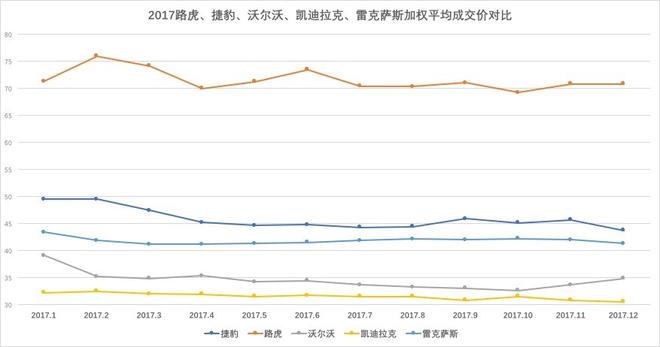 凱迪拉克、捷豹路虎、雷克薩斯、沃爾沃四個品牌銷量在10萬輛以上為第二陣營。除路虎外,捷豹因進口F-pace帶動其成交價上揚,隨著XE國產上市銷售,捷豹銷量有望進一步增長,價格進一步下探;以銷售進口車型為主的雷克薩斯,今年銷量質量不錯,庫存時間短,資金周轉快,多數以訂單方式銷售,加權平均價在42萬上下,成交價格走勢平穩(wěn),經銷商今年利潤也很豐厚。沃爾沃在新款車型的帶動下,成交價格開始上揚;凱迪拉克今年銷量增速較快,通過下圖我們可以看到,凱迪拉克基本依靠低價獲取銷量的增長,成交價格進一步走低,經銷商的利潤需要依靠廠家補貼。