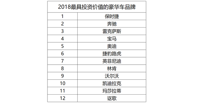 2018年經銷商值得投入的品牌推薦保時捷、奔馳、雷克薩斯;具有增長潛力的品牌推薦寶馬、奧迪、捷豹路虎;謹慎關注的品牌有瑪莎拉蒂、謳歌。
