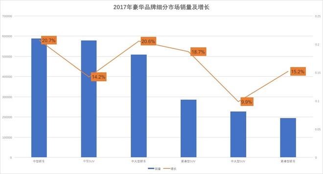 2017年豪華車市場中六大細分市場(中大型轎車、中型轎車、緊湊型轎車、中大型SUV、中型SUV、緊湊型SUV)占據豪華車全年93%的銷量,環(huán)比增長17.3%,市場集中度進一步提升;豪華車企業(yè)如果想與市場同步增長,就不得不在這個六個細分市場投放車型,并提升產品競爭力。