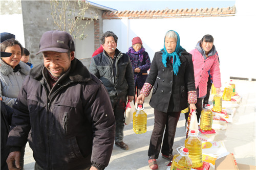 當(dāng)日上午,雖然天氣寒冷,可葉莊行政村村室院里卻暖意融融。該村村主任熊茂禮正在把備好的年貨發(fā)放到49戶村民的手中?!胺浅8兄x茂禮這么遠(yuǎn)回老家看望我們這些困難戶,讓我們過上一個(gè)好年?!爆F(xiàn)年76歲的村民張多朗是個(gè)五保戶,接過熊茂禮送上的年貨連聲道謝。熊茂禮鼓勵(lì)困難戶一定要對(duì)生活充滿信心,樂觀地面對(duì)生活。同時(shí),希望困難戶要保持良好心態(tài),積極面對(duì)困難,自強(qiáng)自立,早日擺脫困境。