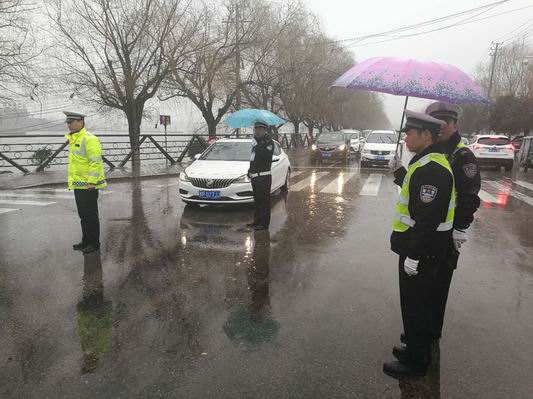 按照會議的統一安排部署,交警大隊城市中隊負責羲皇賓館門前、老看守所路口和商城東路的道路保障工作。執(zhí)勤民警合理分配警力,清理引導路面亂停亂放車輛,合理分流駛入車輛,規(guī)范指揮路口交通,他們克服寒冷下雨惡劣天氣,充分發(fā)揚不怕苦不怕累的精神。在雨中一刻不停的忙碌著,中隊長閆本志的微信運動的步數達到30000多步,成功登頂榜首,交警隊員李炯等帽子淋濕了,衣服淋濕了,鞋子也進水了,他們顧不了這些,一絲不茍的工作。他們的辛苦付出感動了過往司機和行人,一位女士下車送來雨傘,被執(zhí)勤交警婉拒了,后邊的過路行人直接打開車窗為過交警扔下雨傘而去。一會功夫,執(zhí)勤的路口多了各種色彩的花雨傘,在雨中游走,像綻放的太陽花,裝扮了雨中的淮陽。