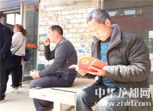 從韓學慎家中出來后,楊素華正好遇到66歲的村民韓武孔。韓武孔拿到憲法后,不顧小賣部前人多噪雜,便坐在一張木床上認真地看起來。