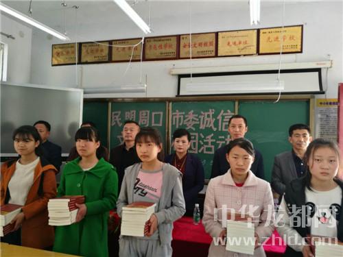 活動當(dāng)日,民盟周口市委一行數(shù)人分別到商水縣新城小學(xué)和張莊一中等學(xué)校舉辦誠信講座,并捐贈數(shù)百本盟員戚富崗編著的誠信圖書。在每一所學(xué)校,盟市委都為同學(xué)們送上一場精彩的講座。他們用鮮明的事例讓同學(xué)們深刻體會到只有內(nèi)心裝滿誠信,品格才會高尚、筆下的文字才會打動人、才會實現(xiàn)理想抱負(fù)有所作為!