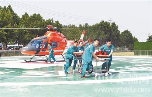 中華龍都網(wǎng)訊 6月28日上午,全市“防災(zāi)減災(zāi)立體救援”航空醫(yī)療救援啟動儀式在周口協(xié)和骨科醫(yī)院啟動??罩芯o急救援一小時內(nèi)全省到達。圖為直升機救援演練現(xiàn)場。