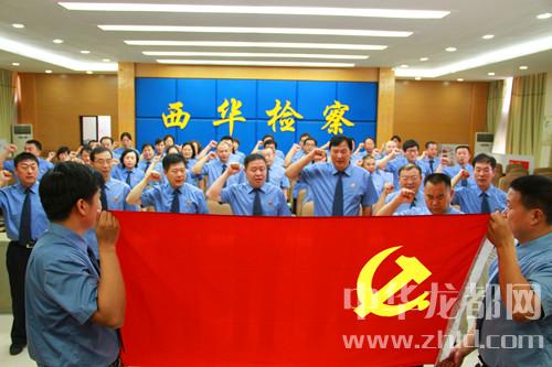 中華龍都網(wǎng)訊(周口報(bào)業(yè)全媒體記者 竇娜 通訊員 屈琳琳)“我志愿加入中國共產(chǎn)黨,擁護(hù)黨的綱領(lǐng),遵守黨的章程,履行黨員義務(wù),執(zhí)行黨的決定……”6月28日,面對(duì)鮮紅的黨旗,西華縣人民檢察院副檢察長、黨支部書記劉新建帶領(lǐng)全體黨員高舉右手,重溫入黨誓詞。