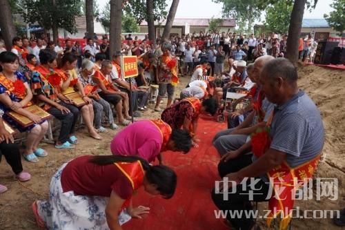 儀式上宣布了對前何行政村31戶孝老愛親之家進(jìn)行表彰的決定,并為他們頒發(fā)了“馬廠鎮(zhèn)孝老愛親之家”牌匾。在《愛的奉獻(xiàn)》樂曲伴奏下,31個孝老愛親之家的孝順兒子、孝順兒媳婦向自己的父母行跪拜之禮。