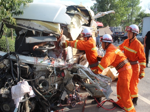 救援人員到達(dá)事故現(xiàn)場(chǎng)后看到,一輛依維柯小型貨車與一輛小型罐車發(fā)生激烈碰撞。小型貨車車頭嚴(yán)重變形,事故現(xiàn)場(chǎng)一片狼藉,玻璃碎片、鐵皮、散落一地,駕駛室內(nèi)司機(jī)被牢牢卡在座椅上不能動(dòng)彈。