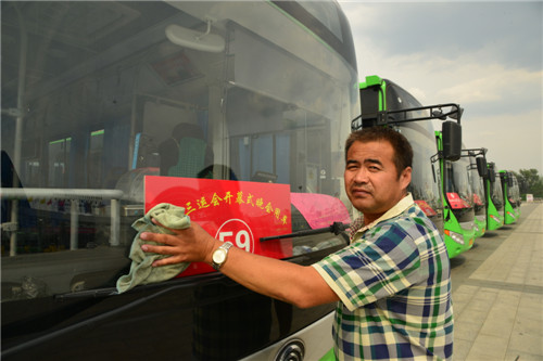 隨著省第十三屆運動會開幕式臨近,近日,市公交總公司接送演職人員的公交車已經增至近百輛,這些公交車的司機每天都要工作到午夜2時許。據悉,從今年4月份省運會先期比賽項目開賽以來,市公交總公司已為省運會出動公交車2800臺班,中心城區(qū)公交候車亭提升改造工程也正在快速推進中。圖為市公交二公司的劉師傅利用閑暇時間擦車。②5記者 梁照曾 攝
