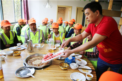 姜玉伸是承擔(dān)鳴鹿路北段保潔任務(wù)的一名老環(huán)衛(wèi)人,他告訴記者:“從今天夏天開始,該店就在店里設(shè)置了環(huán)衛(wèi)工人免費休息飲水點,有時候工作量大的時候,中午回不了家,店老板就讓我們在飯店免費就餐。今天,該店又準備了免費火鍋,讓我們提前過重陽節(jié),我們感覺心里暖暖的。”