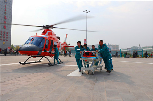 30分鐘后,救援直升機(jī)穩(wěn)穩(wěn)降落太康縣人民醫(yī)院停機(jī)坪,早已在此等候的醫(yī)院醫(yī)護(hù)人員迅速將患者抬下飛機(jī),送往重癥監(jiān)護(hù)室搶救。從接到求救電話到救援結(jié)束,整個(gè)過(guò)程共用時(shí)30分鐘。