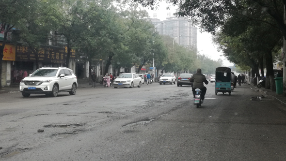 11月8日,記者現(xiàn)場采訪發(fā)現(xiàn),中州大道和人和街交叉口以北路段,路面瀝青剝離脫落、布滿大大小小的坑,碎石子散落滿地,車輛經(jīng)過時,都不得不減速繞行。