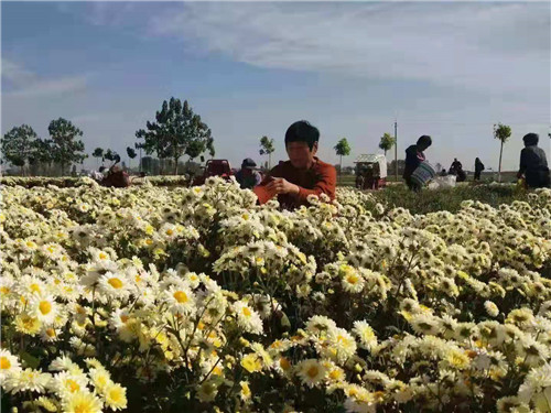當(dāng)日,位于高集鄉(xiāng)北部的黨橋、雙堂等幾個(gè)行政村,也是熱鬧非凡。一臺(tái)臺(tái)大小不同的車輛,滿載著剛從地里摘下的鮮菊花,正往富甲一方菊花加工廠里銷售,縷縷的菊花清香隨風(fēng)飄來,煞是誘人。在富甲一方合作社帶動(dòng)下,今年有16戶貧困戶種植80多畝菊花,鄉(xiāng)政府對(duì)首次種植的貧困戶負(fù)責(zé)技術(shù)培訓(xùn),并給予每畝1000元的生產(chǎn)獎(jiǎng)補(bǔ)。今年菊花每公斤4元左右,麥茬種植菊花每畝可產(chǎn)鮮菊1100-1300公斤,去掉雇人摘菊花費(fèi)用每公斤0.3元,每畝可收入4000-5000元。種植菊花的貧困戶孫建國(guó)在富甲一方收購(gòu)現(xiàn)場(chǎng),正樂呵呵的數(shù)著賣菊花得來的大把鈔票。
