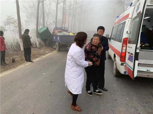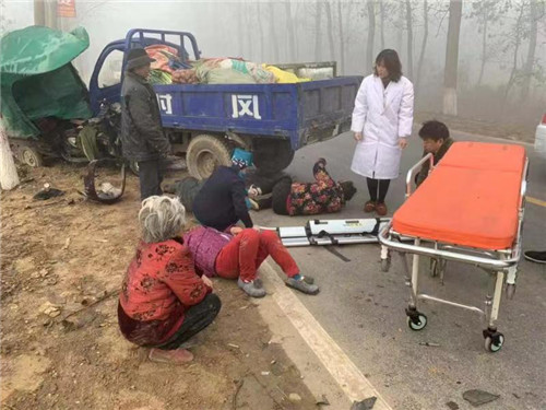 行至不遠處,他們隱約發(fā)現(xiàn)前方有障礙物,并聽到有人呼救。王和平和同事立即下車走進一看,只見一輛農(nóng)用三輪車和一輛電動三輪車相撞,電動三輪車被撞到路邊一顆樹上,整個車身被撞傾斜,事故現(xiàn)場有 4人東倒西歪地躺在地上,傷情不明。