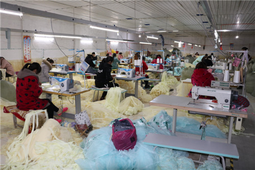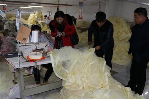 “對(duì)于有勞動(dòng)能力的貧困戶及留守婦女,只要報(bào)名一律錄用,根據(jù)個(gè)人能力提供合適崗位,免費(fèi)進(jìn)行業(yè)務(wù)技能培訓(xùn),變‘輸血’變‘造血’;成為熟練工的貧困戶,月收入均可達(dá)到3000元以上?!苯饎P盛家紡“扶貧車(chē)間”位于吳小廟村邊,該公司負(fù)責(zé)人趙開(kāi)軍是楊湖口鎮(zhèn)走出去打工、在事業(yè)有成后返鄉(xiāng)創(chuàng)業(yè)的一個(gè)普通80后,他的公司總部位于江蘇省南通市,像這樣的幾百人加工基地附近有二三家,加工的產(chǎn)品一般是通過(guò)天貓、京東等知名電商平臺(tái)在全國(guó)進(jìn)行銷(xiāo)售,實(shí)行網(wǎng)上實(shí)行統(tǒng)一下單、就近發(fā)貨,這幾個(gè)基地主要負(fù)責(zé)長(zhǎng)江以北市場(chǎng)銷(xiāo)售,公司去年年銷(xiāo)售額已突破5000萬(wàn)元,解決周邊村莊數(shù)千人在門(mén)口就業(yè),帶動(dòng)100多戶貧困戶脫貧。