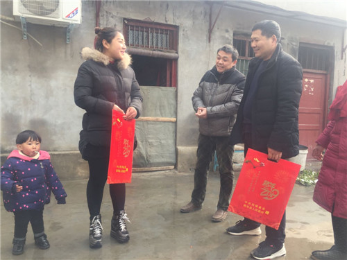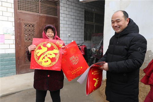1月16日,西華縣艾崗鄉(xiāng)鐵爐村村民馬永清接過(guò)該縣縣委宣傳部駐村扶貧干部送來(lái)的春聯(lián)喜上眉梢。據(jù)了解,今年春節(jié)前夕,該縣財(cái)政投入200余萬(wàn)元購(gòu)置80萬(wàn)副春聯(lián)在全縣鄉(xiāng)村范圍內(nèi)廣泛開(kāi)展贈(zèng)春聯(lián)、送祝福活動(dòng)。
