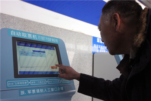 1月20日,旅客在周口火車站自動售票機(jī)取票。記者 金月全 攝