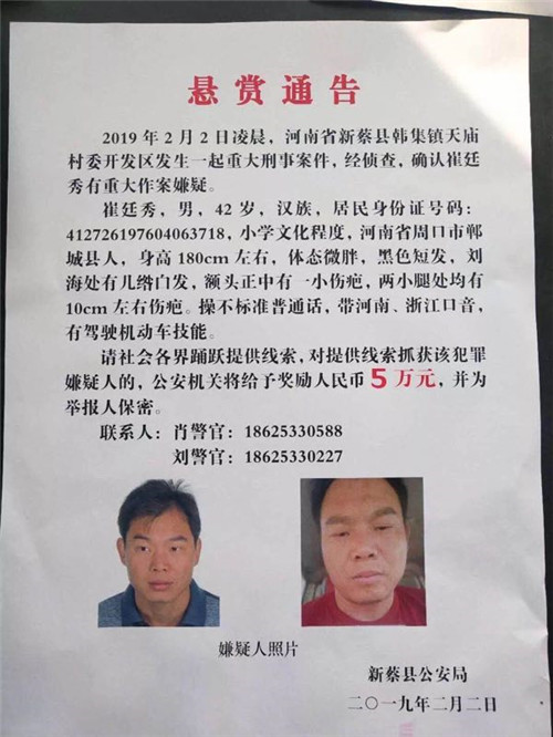 2月2日凌晨,駐馬店新蔡縣韓集鎮(zhèn)發(fā)生一起重大刑事案件,犯罪嫌疑人崔某因懷疑其妻子與受害人楊某有不正當(dāng)關(guān)系,午夜駕車沖進(jìn)受害人楊某的居住地放火將其殺害,犯罪嫌疑人崔某趁夜色潛逃。新蔡縣公安局黨委啟動(dòng)重大刑事案件偵破機(jī)制,緊急發(fā)布公安協(xié)查通報(bào),請(qǐng)求兄弟單位協(xié)助抓捕。并發(fā)布懸賞通告,懸賞5萬(wàn)元通緝崔某。結(jié)合犯罪嫌疑人崔某可能逃跑路線,新蔡警方先后輾轉(zhuǎn)溫州、青島、臨泉、周口等地開(kāi)展抓捕工作,均未果。
