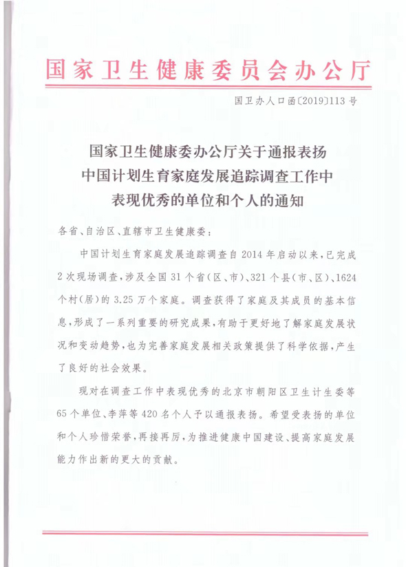 通知顯示,中國計劃生育家庭發(fā)展追蹤調查自2014年啟動以來,已完成2次現場調查,涉及全國31個?。▍^(qū)、市)、321個縣(市、區(qū))、1624個村(居)的3.25萬個家庭。調查獲得了家庭及其成員的基本信息,形成了一系列重要的研究成果,有助于更好地了解家庭發(fā)展狀況和變動趨勢,也為完善家庭發(fā)展相關政策提供了科學依據,產生了良好的社會效果。國家衛(wèi)健委對在此項工作中表現優(yōu)秀的65個單位、420名個人進行通報表揚,希望受表揚的單位和個人珍惜榮譽,再接再厲,為推進健康中國建設、提高家庭發(fā)展能力作出新的更大的貢獻。