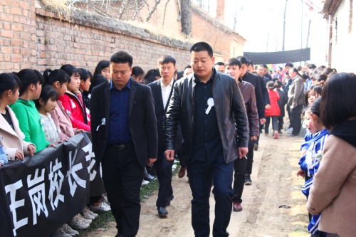 院內(nèi)正廳上方,懸掛著黑底白字的橫幅“沉痛悼念王崗?fù)尽?,院外道路兩?cè),擺滿了人們敬獻的黑紗、花圈。市教體局領(lǐng)導(dǎo)來了,縣政府副縣長肖煒來了,縣教體局局長劉現(xiàn)營來了;局黨組成員、各鄉(xiāng)校校長來了,王崗最愛的學(xué)生、同事來了;學(xué)生家長也來了……大家胸佩白花,向這位愛崗敬業(yè)的基層校長表示崇高的敬意和深切的哀悼。
