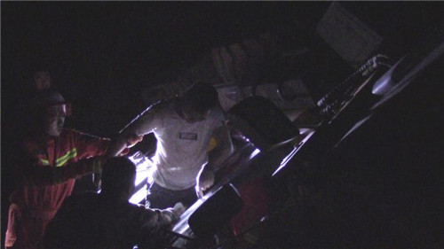 當夜,消防指戰(zhàn)員接到調(diào)派命令后迅速趕往事故現(xiàn)場。指揮員觀察了解得知,側(cè)翻的是一輛重型推土車,由于作業(yè)區(qū)地面不平,司機在倒車時車輛發(fā)生側(cè)翻,欲打開車門跳車未果,左臂反而被車輛駕駛室一側(cè)死死壓在地面上,無法動彈。當時工地上沒有同事,周邊也沒有行人,呼救無應后,司機忍著巨烈疼痛摸到手機電話求救。