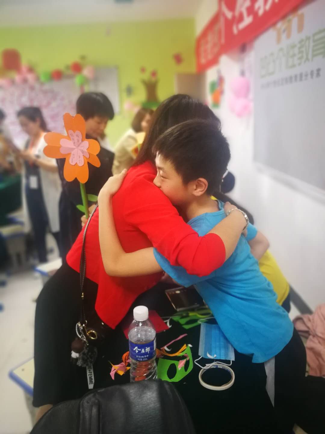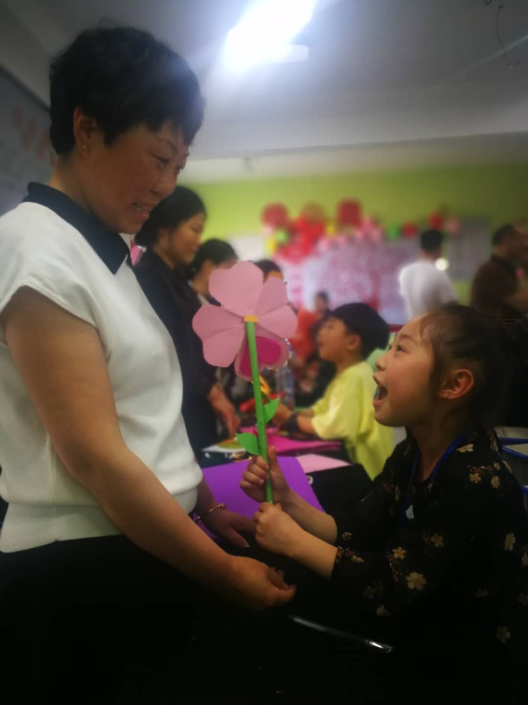 活動(dòng)上,在專業(yè)手工教師的指導(dǎo)以及媽媽的配合下,這些小記者自己動(dòng)手利用剪刀、雙面膠、彩紙等學(xué)習(xí)制做康乃馨紙花。五層紅色的花瓣、兩片綠葉、一根花枝,經(jīng)過(guò)近一個(gè)小時(shí)的反復(fù)實(shí)踐,一朵朵紙花陸續(xù)制好,成功的喜悅映紅了孩子們的笑臉。在祝??ㄆ蠈懴聦?duì)媽媽的祝福語(yǔ)后,孩子們手捧用彩紙包裝好的紙花,拿著祝福卡送到母親手中,和媽媽熱情擁抱、向媽媽表達(dá)愛(ài)的祝福。
