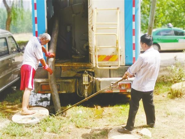 站在公廁旁的污水邊,該負(fù)責(zé)人指揮專門處理糞液的車輛到達(dá)現(xiàn)場,并就該公廁的情況向記者進(jìn)行說明。“這個(gè)公廁是由市園林處負(fù)責(zé)修建的,建好投入使用的時(shí)候就沒有鋪設(shè)污水管道,只配套了一個(gè)能容納9立方米污水的化糞池。因?yàn)楦浇行V場,健身的市民多,公廁使用的頻率高,一個(gè)化糞池不夠用,我們又增加了一個(gè)能夠容納10立方米污水的化糞池,定期進(jìn)行清理?!痹撠?fù)責(zé)人說。
