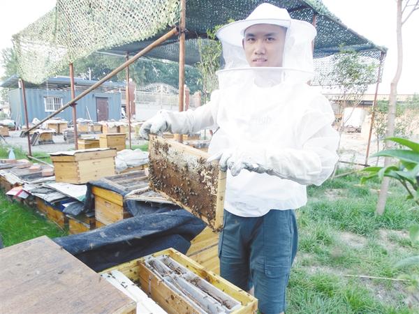 6月24日,沈丘縣付井鎮(zhèn)九里村的退伍軍人蘇尚方,正小心翼翼地從蜂箱里取出蜂蜜板,準(zhǔn)備采收蜂蜜?!拔茵B(yǎng)了120多箱蜜蜂,年產(chǎn)蜂蜜3000多公斤,經(jīng)濟收入十分可觀。”蘇尚方說,他專門成立了蘇家養(yǎng)蜂專業(yè)合作社,帶領(lǐng)當(dāng)?shù)刎毨粢黄鹈撠氈赂?。謝辛凌 攝