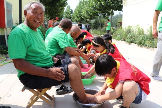 7月的太康,酷熱難耐。6日上午8時許,一輛公交車穩(wěn)穩(wěn)??吭谔悼h芝麻鄉(xiāng)敬老院門口,車上下來20多名身穿紅馬甲的學生志愿者,他們抬著米、面、油和雞蛋等物品走進敬老院。坐在門口等候的老人們,樂呵呵地上前迎接客人。整個敬老院一下子熱鬧起來。放下物品,孩子們立馬開始勞動,他們從老人們宿舍搬出馬扎、板凳,在院中擺放安穩(wěn),扶著老人坐上去,開始給老人洗腳。正上初中一年級的李博泉細心地幫72歲的張照志老人摳掉趾甲縫和腳底的污垢。張老漢流淚了:“這輩子有人給我洗腳,我真是不知道哪修來的福氣……”
