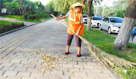 在中原路上冒著高溫打掃人行道的環(huán)衛(wèi)工人。