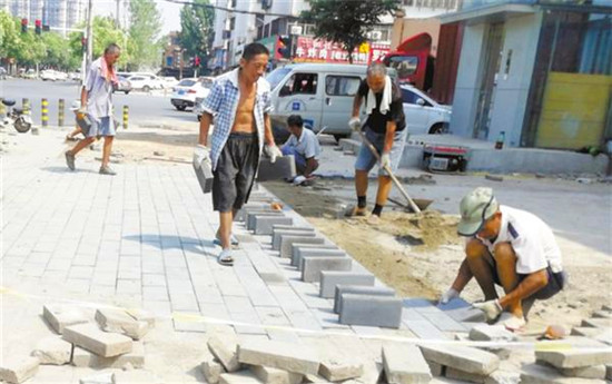 中州大道與文昌大道交叉口處,工人們在烈日下鋪設人行道地磚。