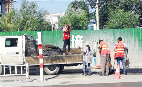 工農南路,市政人員正在烈日下緊張地鋪設瀝青路面。