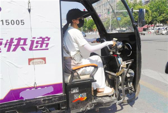 一名美女快遞員在八一大道與黃河路交叉口等待紅綠燈。