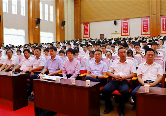 肖煒和與會領(lǐng)導(dǎo)同志分別向考入清華大學(xué)、北京大學(xué)的優(yōu)秀畢業(yè)生頒發(fā)獎金、贈送鮮花。鄲城一高黨委副書記白忠璽匯報了該校2019年高考成績,副校長張暉宣讀了學(xué)校表彰文件。