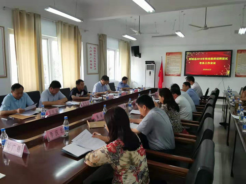 8月23日,鄲城縣召開2019年特崗教師招聘面試考務工作會議,明確分工,強化責任,確保考務工作順利??h政府辦公室副主任楊培爭、縣紀委常委趙天位、縣編辦主任王民仰、縣教體局局長劉現營、縣人社局局長劉自忠、縣公安局治安大隊教導員葛染,以及面試工作組全體人員參加會議。