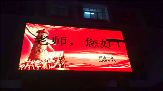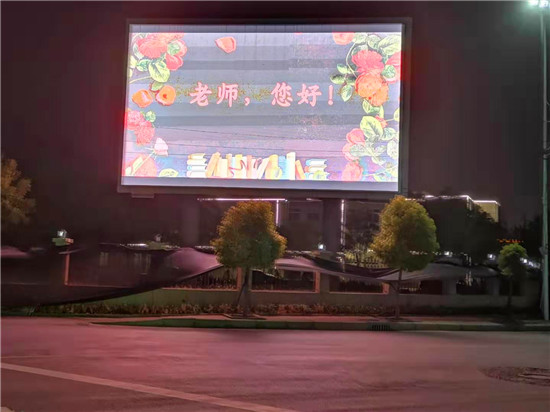 “老師,您好!”9 月10日晚上,鄲城縣人民公園大屏幕上,向全縣教師發(fā)出了溫暖、明亮的祝福。同一時刻,城區(qū)各主要街道公共LED大屏幕,以及縣一高、三實(shí)小等城區(qū)學(xué)校和石槽一中、秋渠一中等鄉(xiāng)村學(xué)校的顯示屏上,“老師,您好”四個大字在夜幕下顯得格外的醒目與亮眼。教師節(jié)當(dāng)夜,老師儼然成為了“夜空中最閃亮的星”。